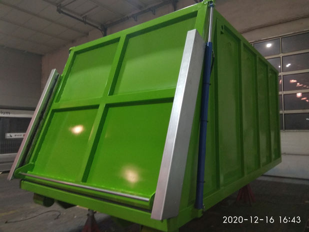 Hook containers with a capacity of 23m3 equipped with moving floor systems and hydraulically operated gates for transporting and dispensing BIO fractions.